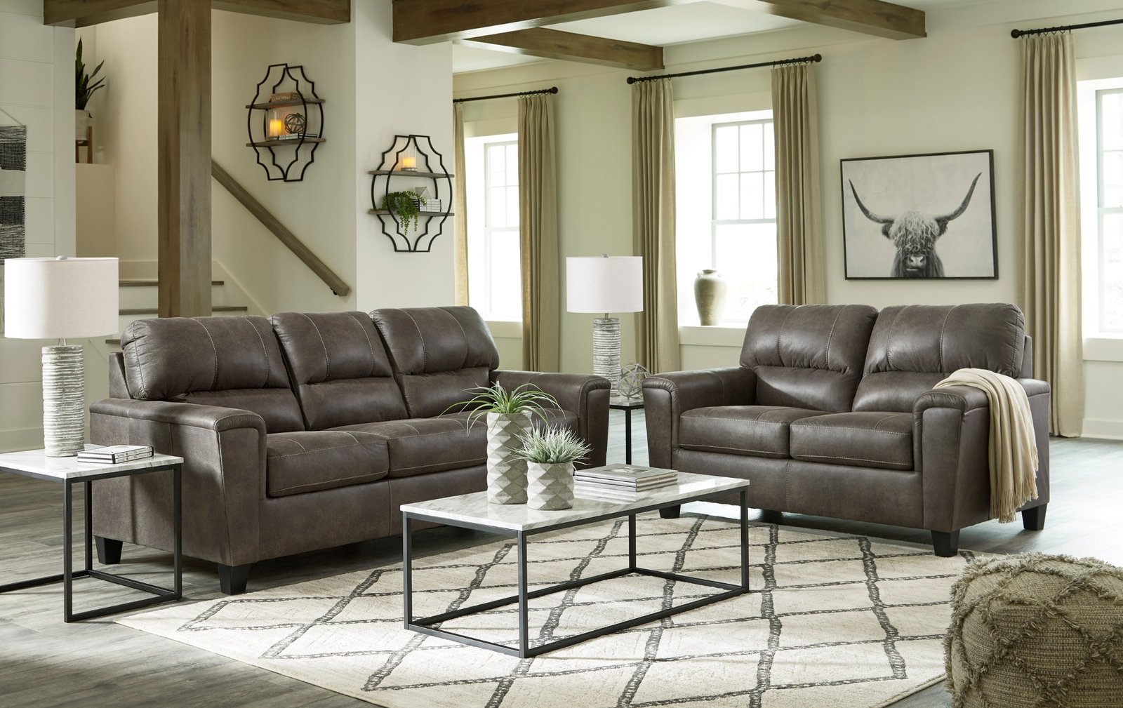 If you love the cool look of leather but long for the warm feel of fabric, you can take comfort in this 2-piece set with sofa and loveseat. Wrapped in a fabulous faux leather with a weathered hue and hint of pebbly texture to resemble the real deal, this decidedly modern ensemble proves less is more. Elements include angled side profiling and track armrests wrapped with a layer of pillowy softness for that little something extra. Prominent jumbo stitching and clean-lined divided back styling lend fashion-forward flair. dimensions sofa 89″ W x 38″ D x 39″ H, loveseat 61″ W x 38″ D x 39″ H.